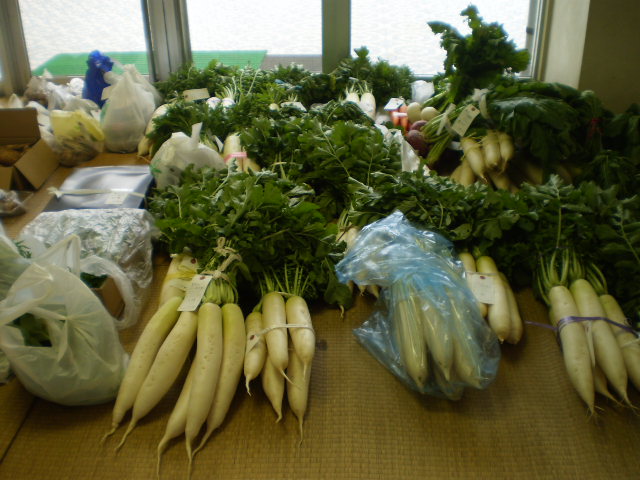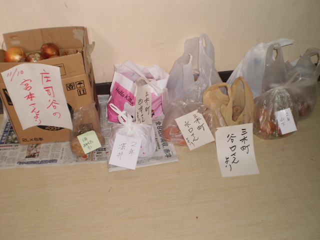 白菜や大根、梨や米などを次々に運びに来られています。