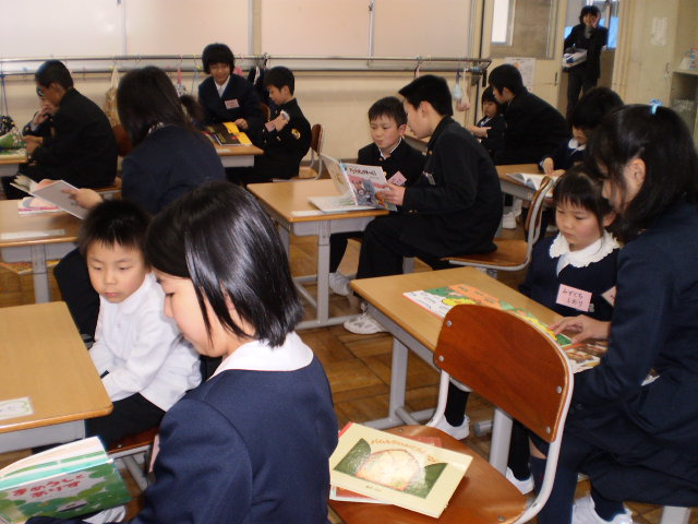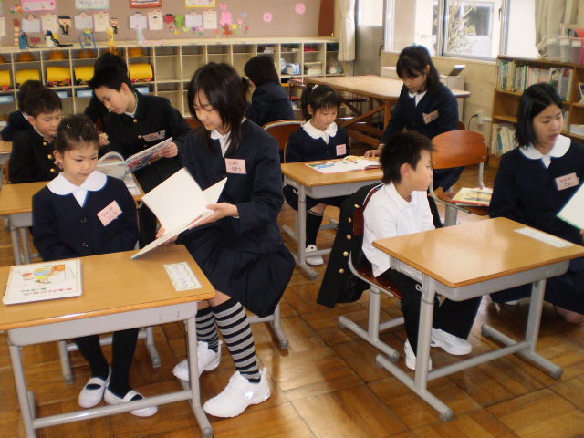 朝自習をのぞきに行くと、6年生が1年生の教室で、絵本を読み聞かせていました。