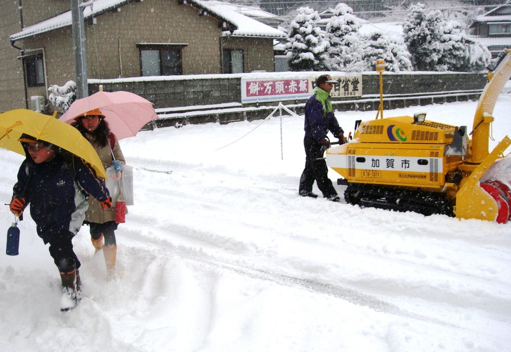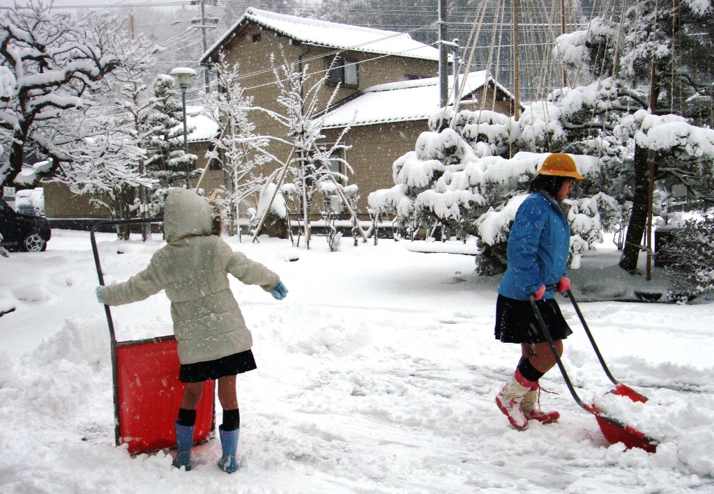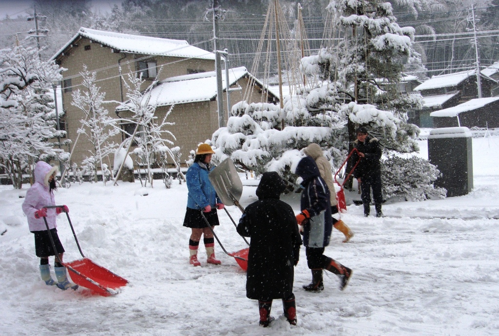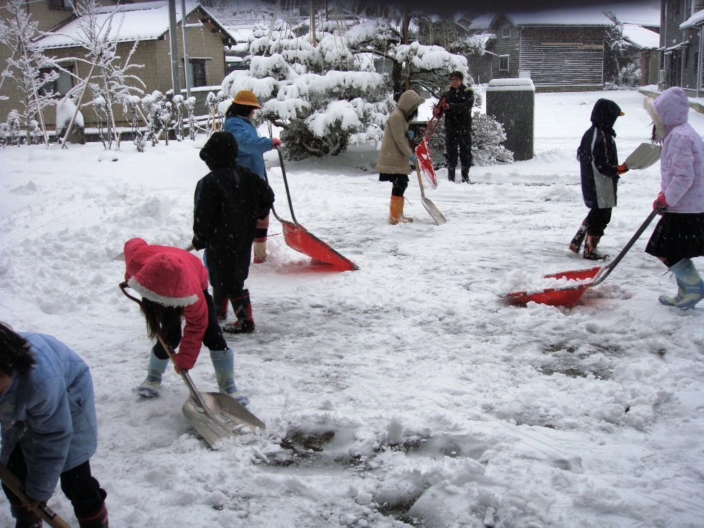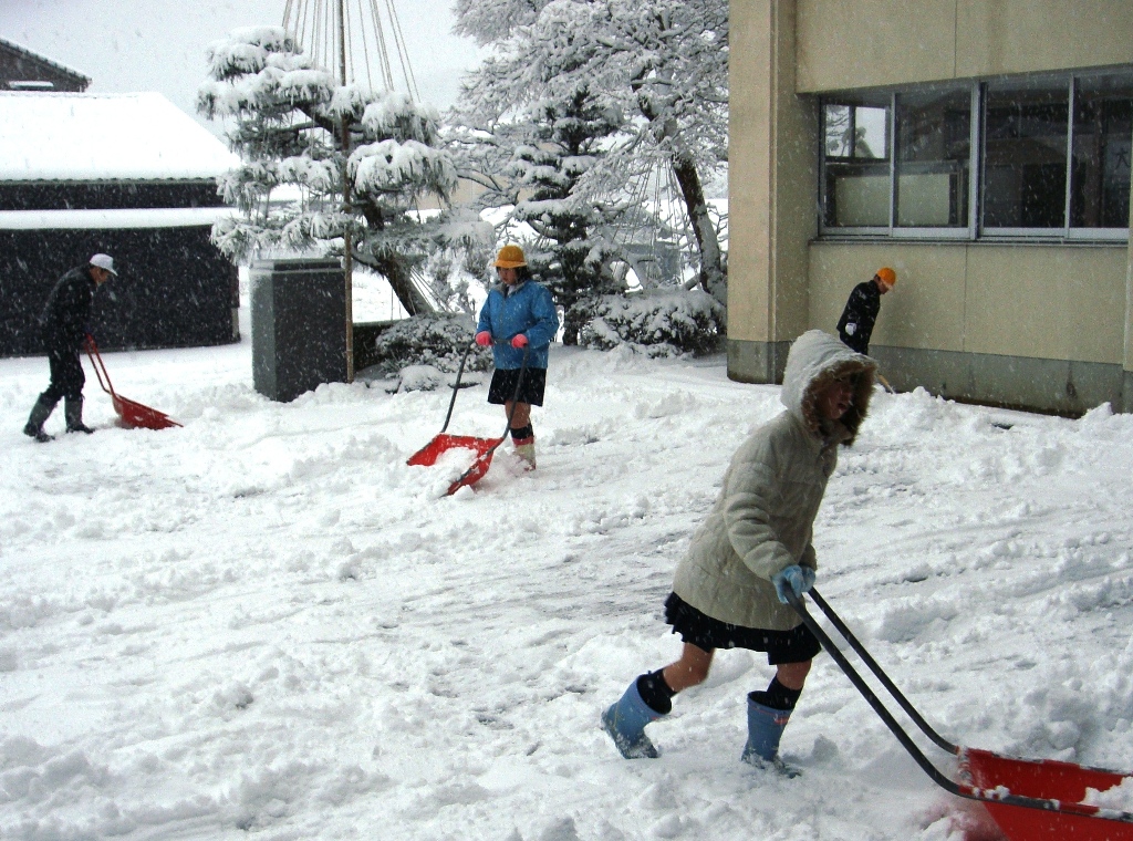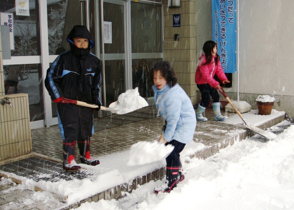 早く登校した児童や教職員が、スノーダンプやスコップを持って玄関や駐車場の雪をどかしました。まちづくり協議会会長さんも、早朝から学校へ駆けつけてくださいました。小型除雪機で道路の除雪をして応援して下さいました。大変ありがたく思いました。