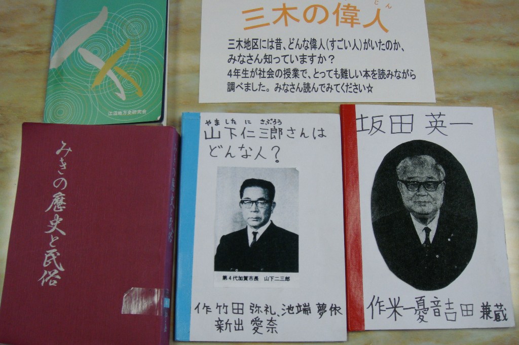 三木小学校の玄関には、立派な胸像が飾ってあります。3年生が、「この人は誰だろう。なぜこんな立派な像が出来たんだろう」と疑問を持ち、三木の歴史の本を元に調べてまとめました。難しい語句は、辞書で調べ最後のページに意味も書きました。坂田英一氏は、「農政の神様」と言われた人物です。山下仁三郎氏は第4代加賀市長で郷土の環境整備に貢献された方です。三木の地区には偉人がたくさんおられます。子どもたち自身で調べ、故郷を誇りに思い愛すること大切なことです。