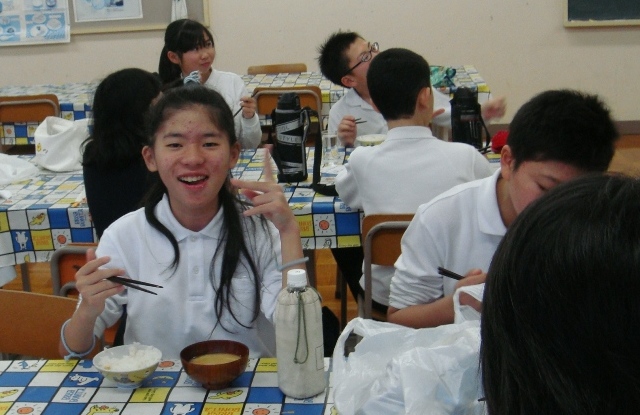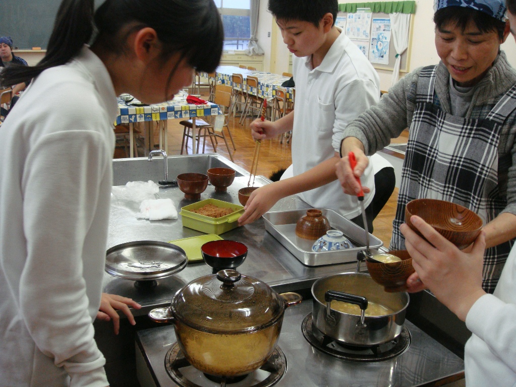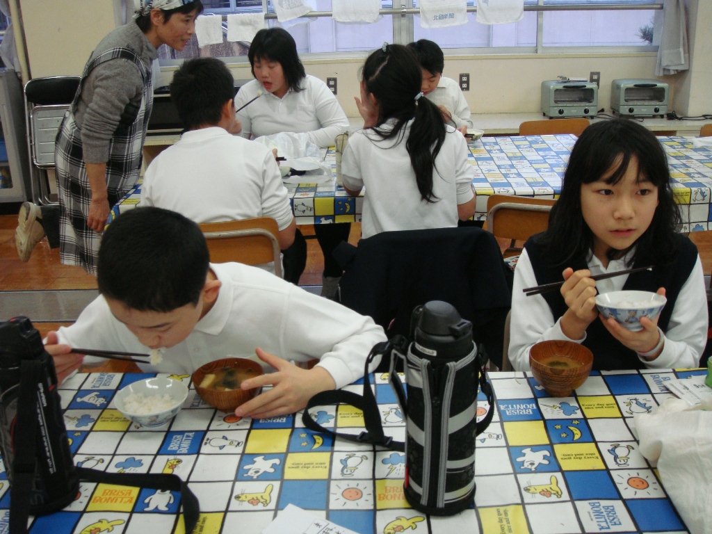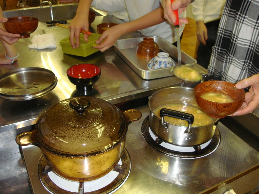 6年生が家庭科でご飯とみそ汁を作っていました。出しは、煮干しか鰹節でしっかり取り、お米は鍋で炊きました。うっすらとお焦げがついた炊き立てご飯の味は最高の出来栄えでした。私も頂きましたが、ジャガイモ、わかめ、油揚げの味噌汁は出しが効いておいしかったです。ご飯とみそ汁が作られれば、大人になって一人暮らししても困らないですね。
