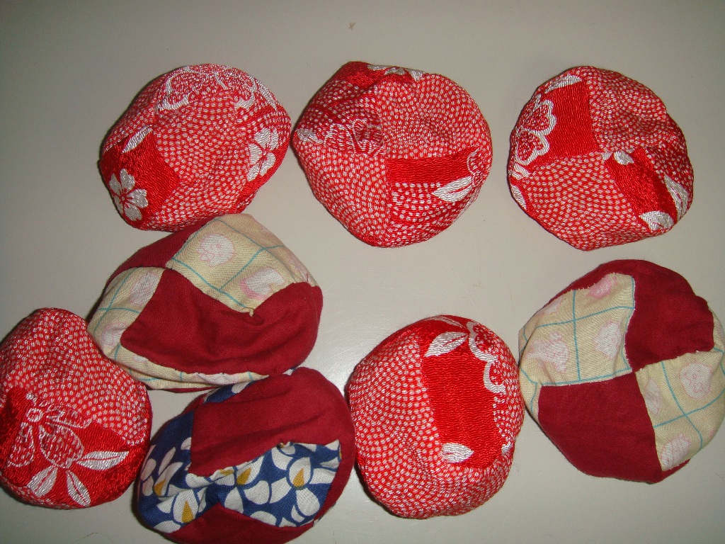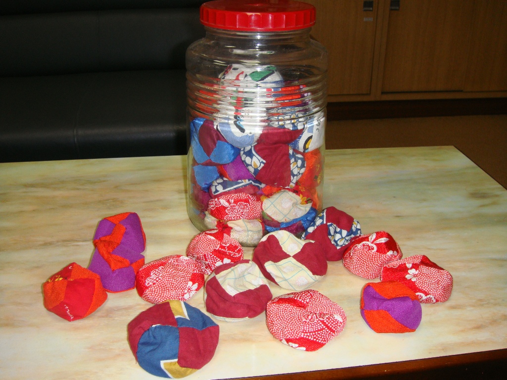 1月のふれあい交流会で使うお手玉が、虫に食われ古く破けてしまったことを聞き、1年生のHさんのおばあちゃんが、たくさん作って持ってきて下さいました。ガラス瓶に入れておけば、虫にも食われないからと、果実酒用の瓶まで頂きました。着物の端切れを利用して色とりどりのかわいいお手玉がぎっしり詰められていました。