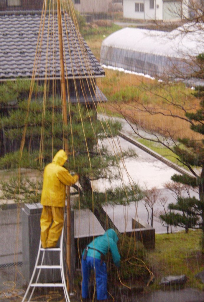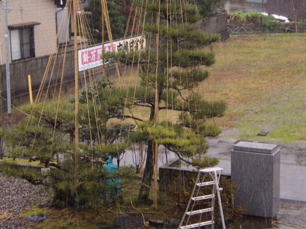 昨日は、一日中みぞれが降る寒い日でした。そんな中、3人の職人さんが校庭の松やツツジに雪つり作業をして下さいました。放射線状に張りめぐらされた縄は、幾何学模様で冬の風物詩といった所です。寒い中の作業、大変お疲れ様でした。