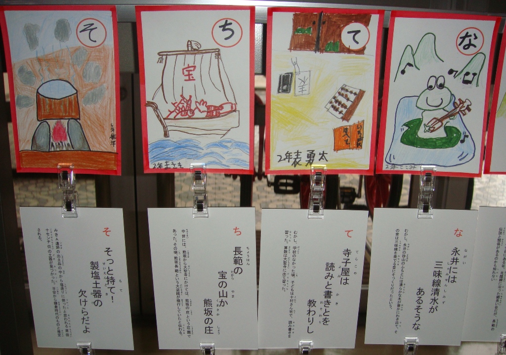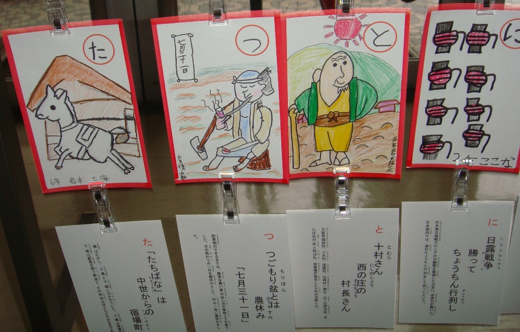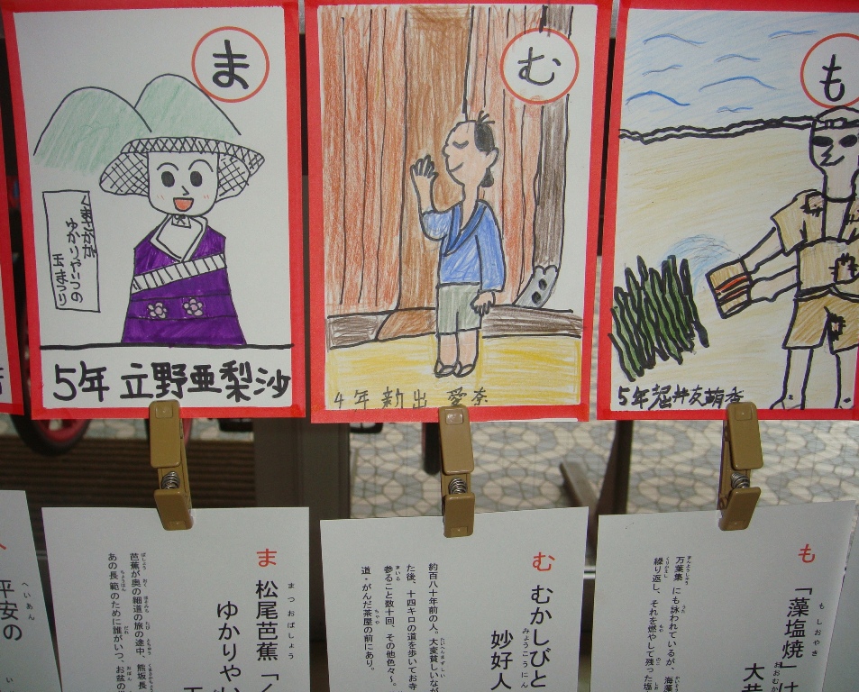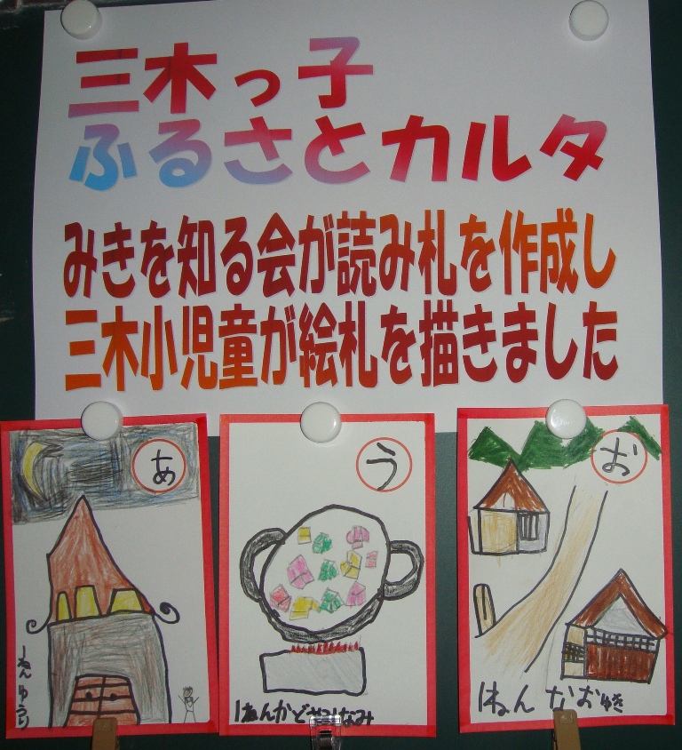 「三木を知る会」の方々が読み札を、全校児童が絵札を作りました。その「三木っ子ふるさとカルタ」が完成しました。児童玄関前にずらっと掲示してあります。1年生から6年生まで全員が、会員の方々から、読み札の意味を教えてもらい、絵の指導もしてくださったお蔭で大変素晴らしいカルタになりました。ふるさとを知り、愛着を持つ良い機会となりました。1月の子ども新年会でカルタ取りをして楽しみます。