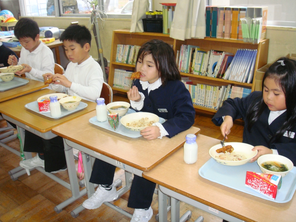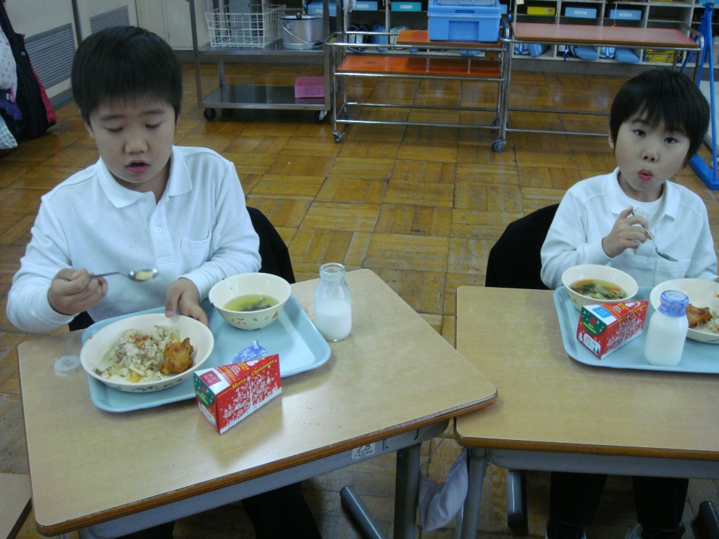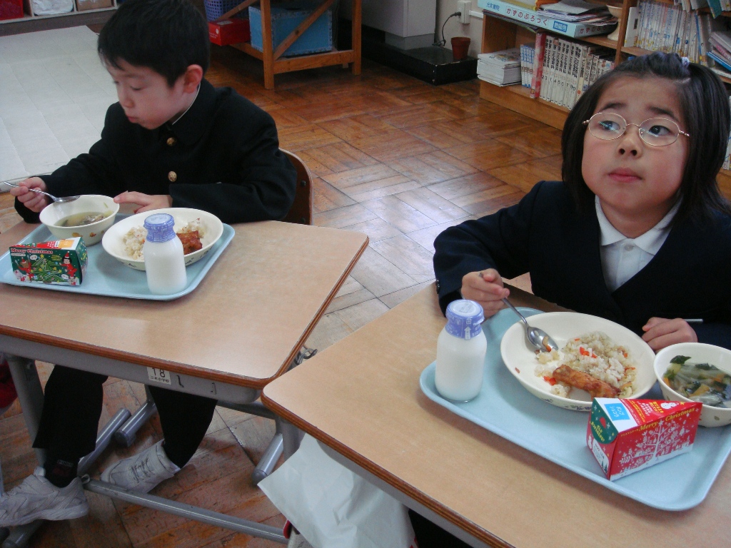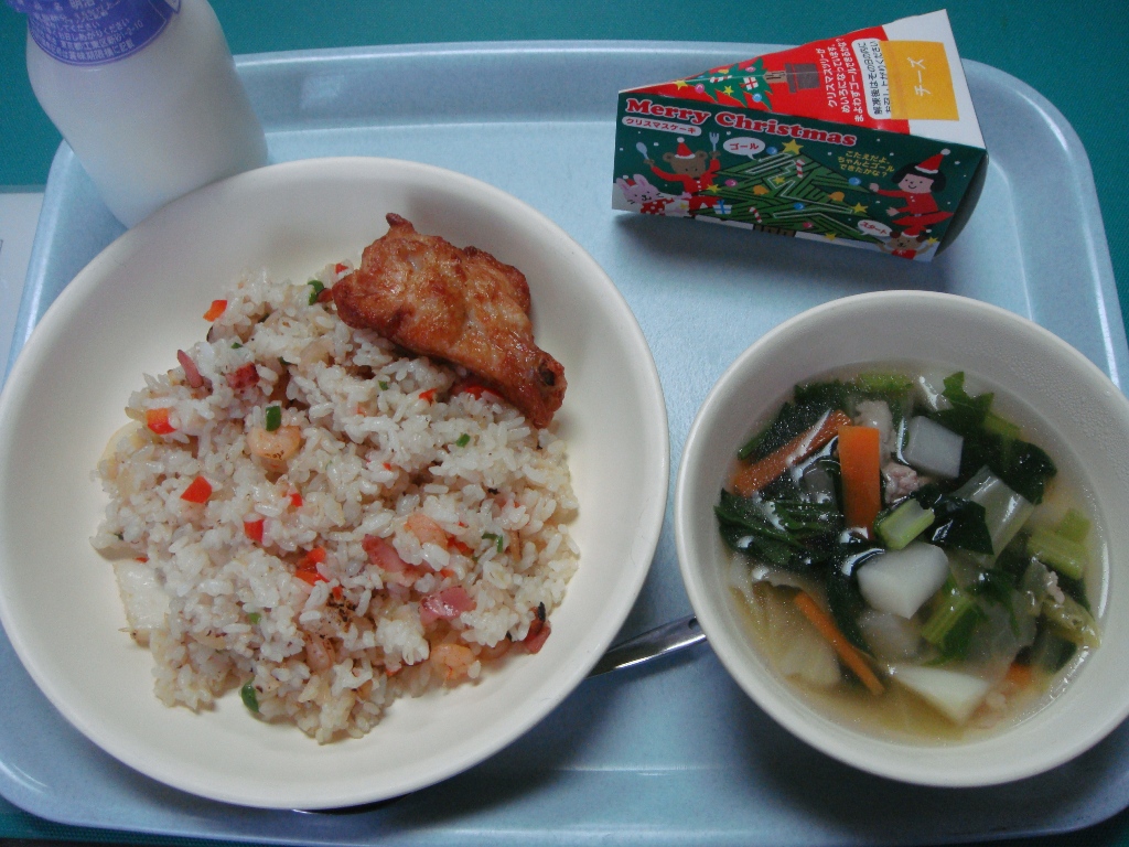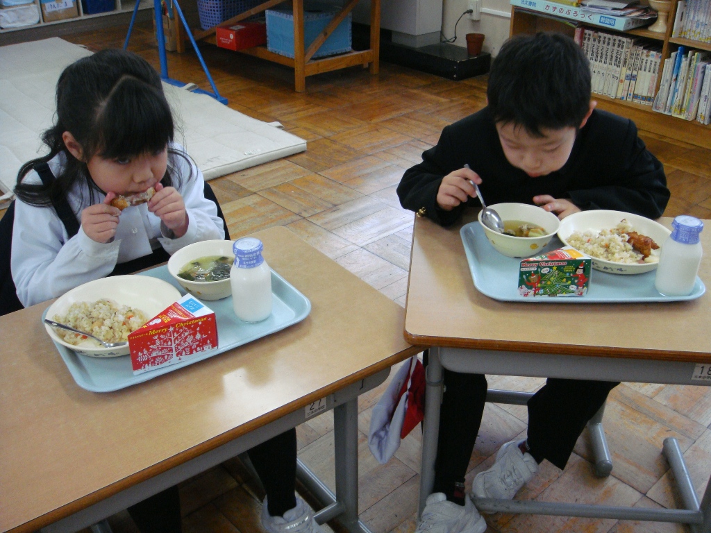 12月21日の最後の給食メニューは、クリスマスが近かったので、鶏の空揚げやケーキが出ました。みんなおいしそうに骨付き唐揚げをほおばっていました。学校給食は、食材やメニューの幅が広く、家庭では出たことのないメニューも食べられて食教育の一端を担っています。
