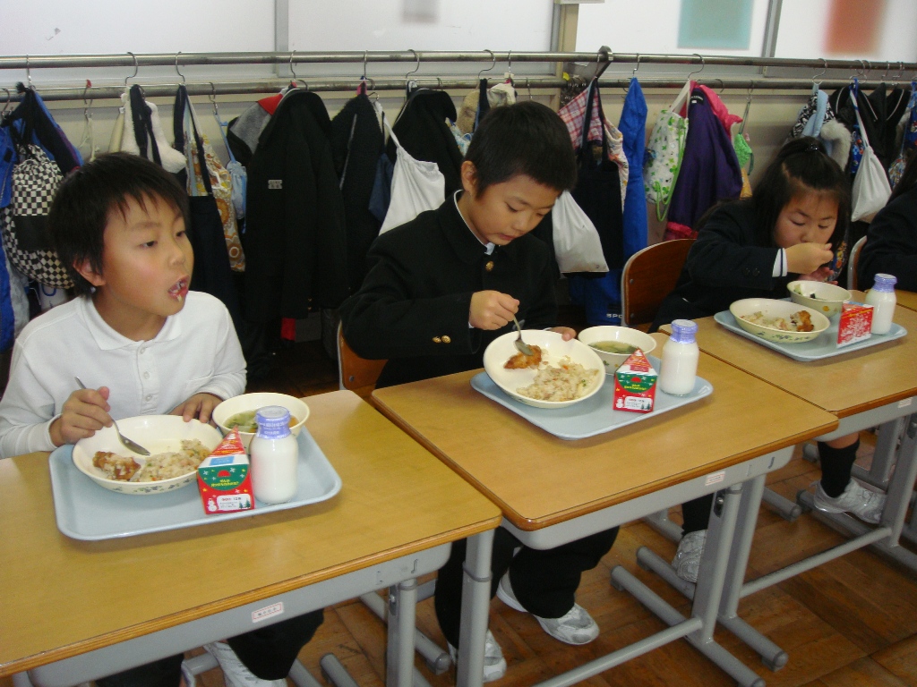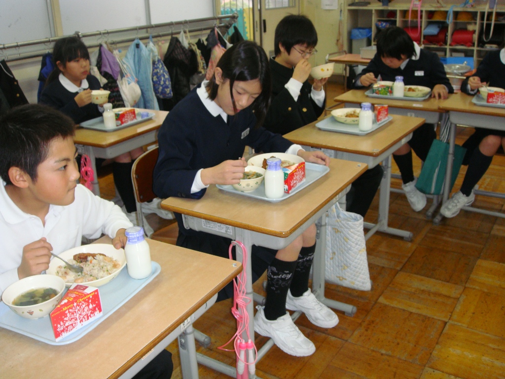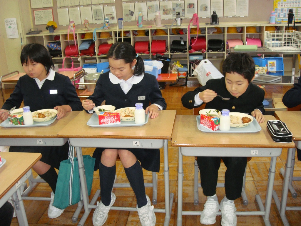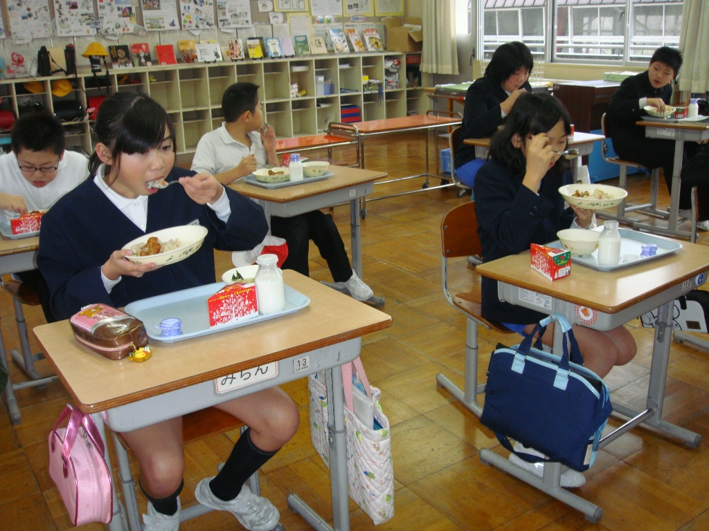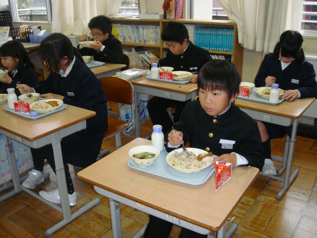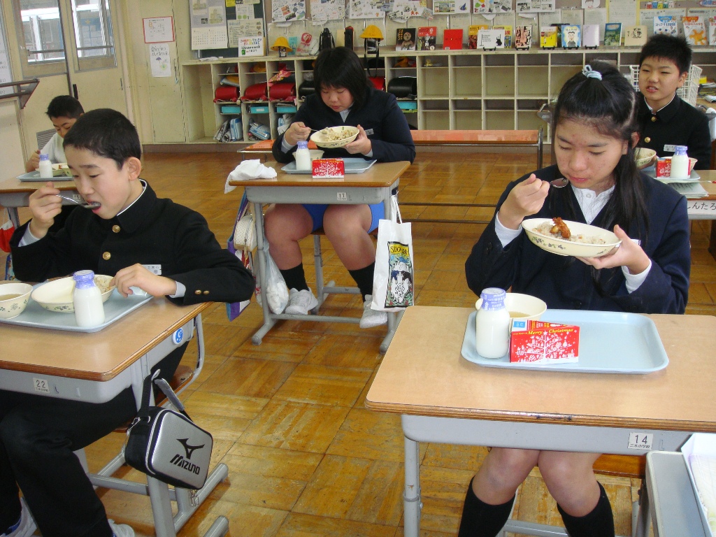 12月21日の最後の給食メニューは、クリスマスが近かったので、鶏の空揚げやケーキが出ました。みんなおいしそうに骨付き唐揚げをほおばっていました。学校給食は、食材やメニューの幅が広く、家庭では出たことのないメニューも食べられて食教育の一端を担っています。