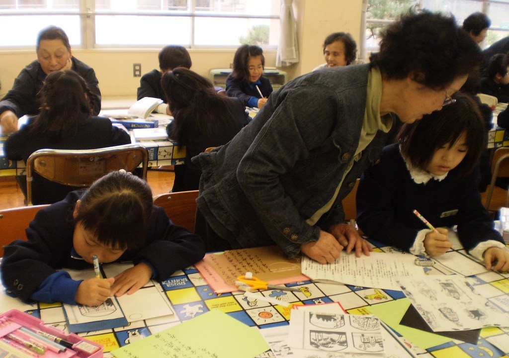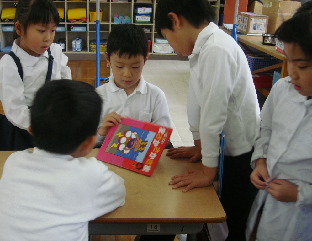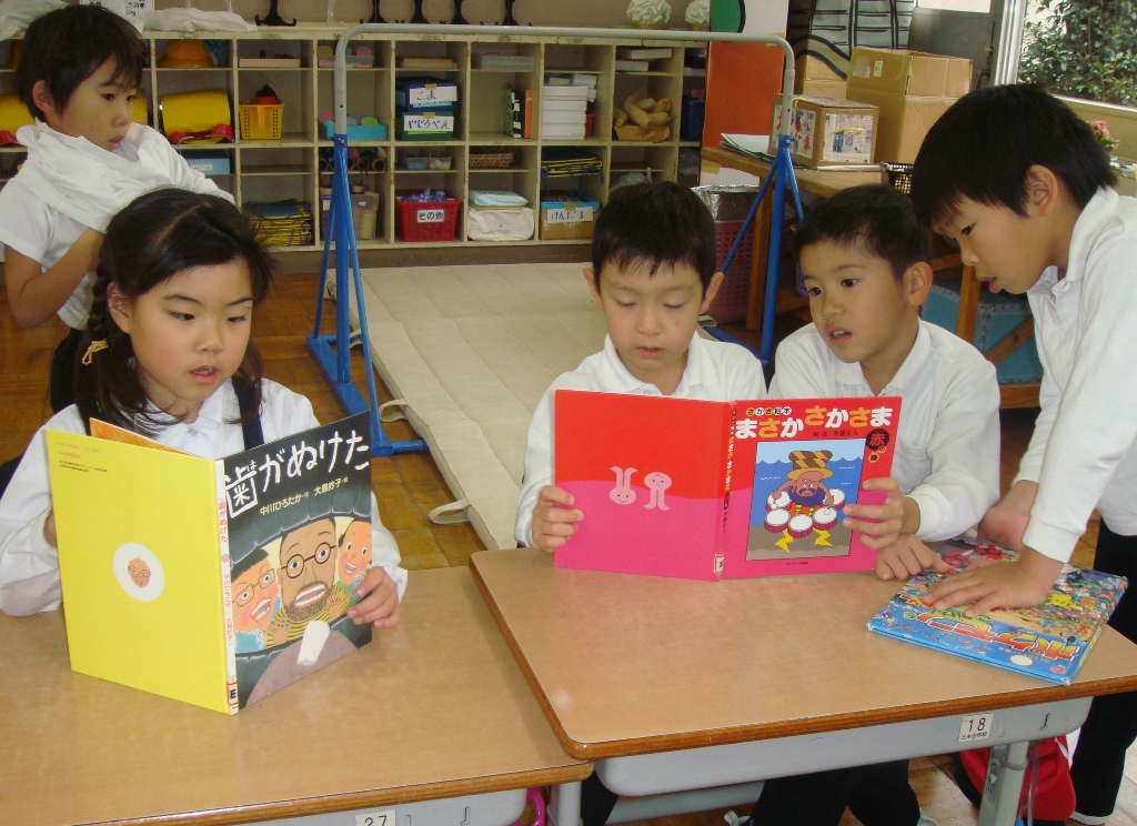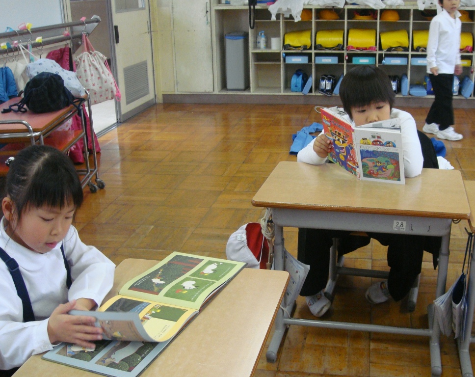 掃除が終わり教室に戻ってくると、まず、着替えをします。早く着替えた子は、5時間目の授業までの隙間の時間に、机から本を出し、すぐに読み始めます。読書が習慣になってしまっているので、誰に言われなくても毎日自然にしています。友達が面白そうな本を読んでいると、近寄って一緒に読むこともあります。1年生は、みんな読書が大好きになりました。