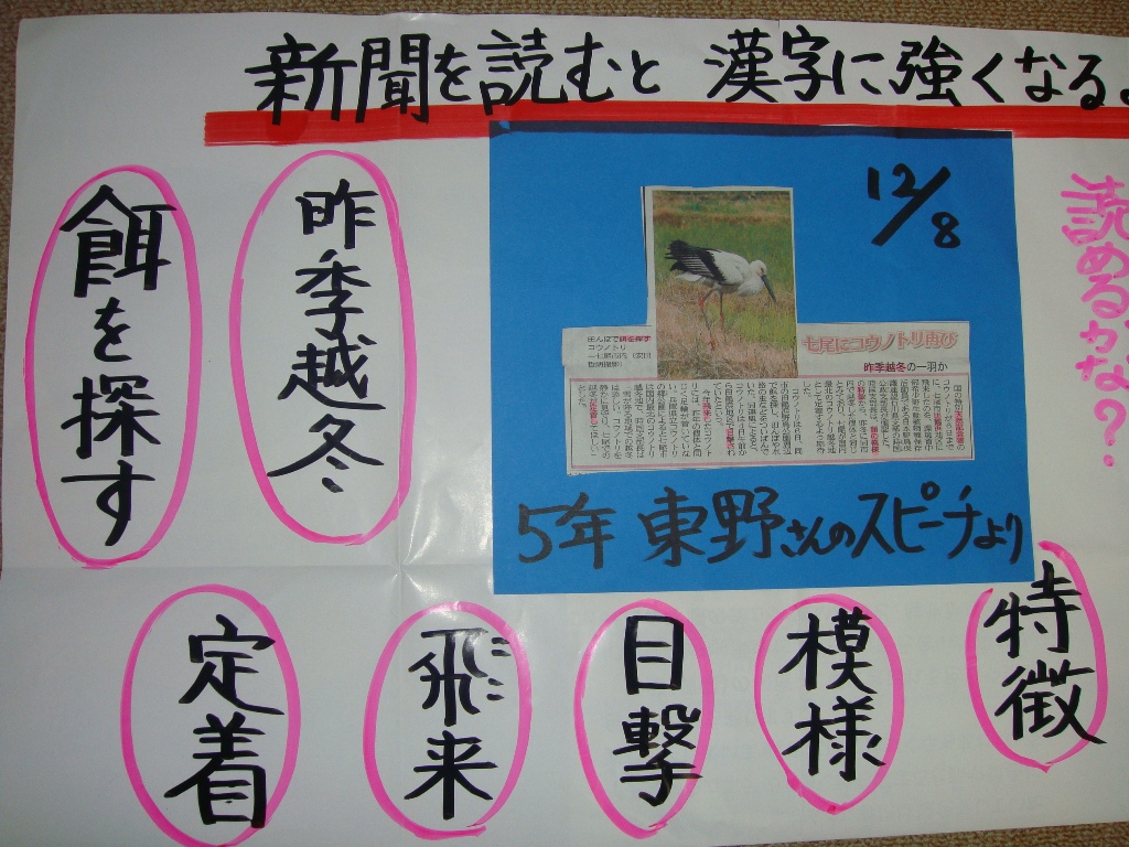 今朝も3人の児童が、新聞スピーチを練習しに校長室へやって来ました。5年生の男子は、七尾市の田鶴浜地区で越冬しているコウノトリの話題でした。要点をまとめ上手に話していました。
