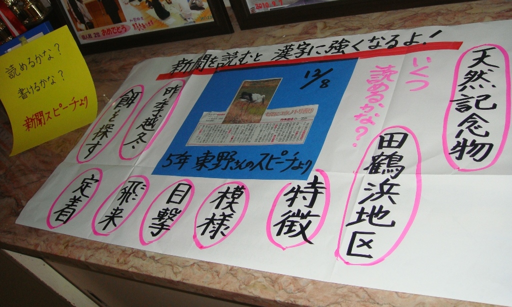 記事の中には難しい漢字がたくさん出てきます。それを廊下に貼りだしました。毎日新聞を読み、漢字に強くなってほしいです。