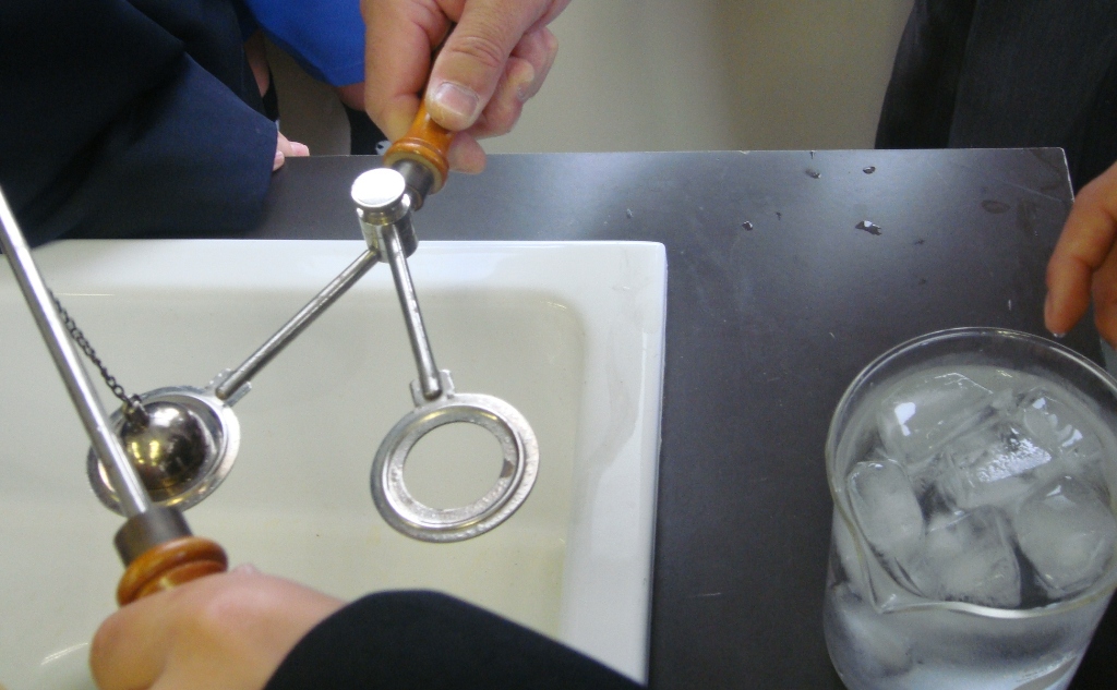 4年生が「温度によって金属の体積が変化するか?」の実験をしていました。