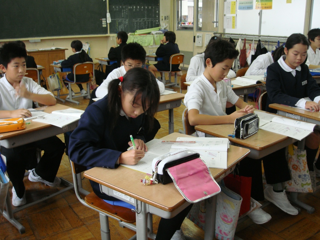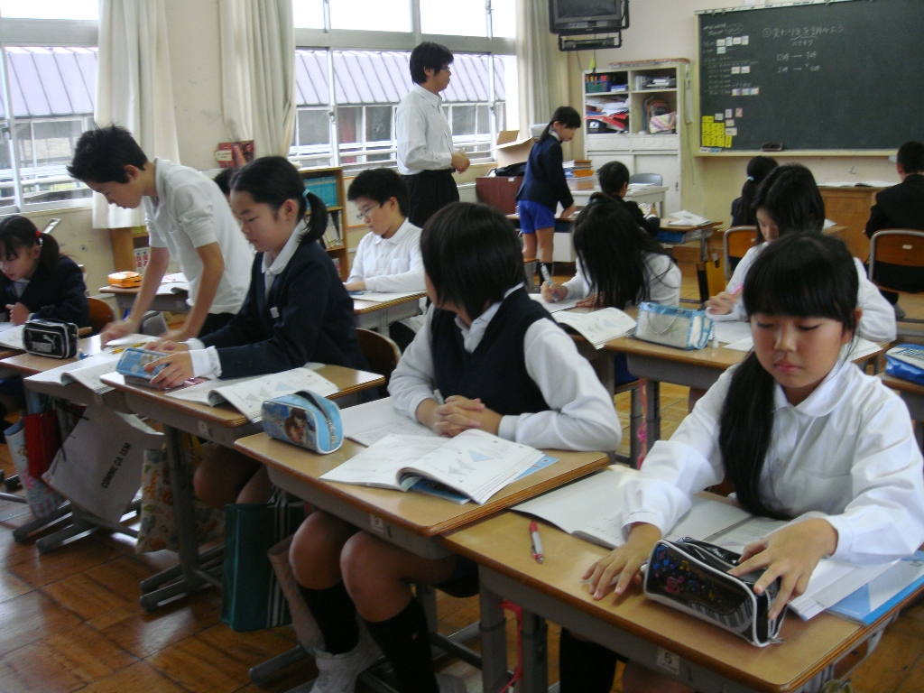 複式授業では、教師が一方の学年に新しいことを教えている間、もう一方の学年は自学自習を行います。4年生は、数量の変化の決まりを見つける学習、5年生は三角形の面積の求め方を学習していました。間接指導の時は、ガイドが進行します。放課後、個別に補習して理解をはかることもあります。どの子にも、確かな学力を付けるよう取り組んでいます。