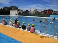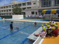 今年も1年生が着衣泳に挑戦しました。水を吸った洋服は重く、手足がうまく動きません。「なんか、いつもとちがう!」「重たい」と感想を言っていました。その後、用意してきたペットボトルを抱え、「浮いて待つ」姿勢を体験しました。