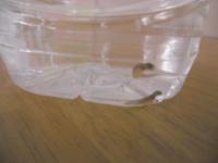 ペットボトルに入った小さい魚をそっと川に流してあげました。