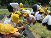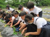 地域の方からいただいたサツマイモの苗を、なかよし学年(1・6年、2・4年、3・5年)で植えました。