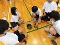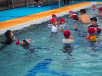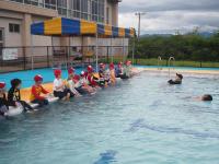 今日は夏休みを迎えて、水の事故にそなえて1年生が着衣水泳体験をしました。