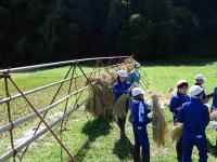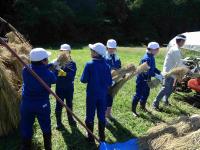 地域の方々のご指導のもと、乾燥していい香りのする稲を稲架から外し、コンバインで脱穀してもらいました。