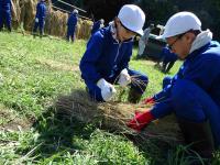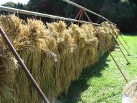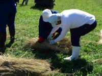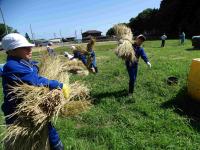 また、脱穀した後の藁を縛って、ビニルハウスまで運びました。