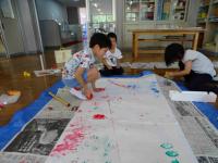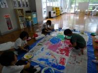スタンプの材料、共用の絵の具やローラーなど、写してできる形や色を並べたりつないだり重ねたりするなどして、