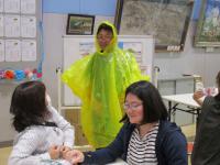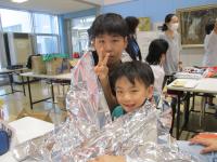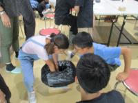 また、学校で各自が備えている防災リュックの中身のアルミブランケットやポンチョを広げ、どんな場面でどう使うか確認しました。「大人おらん時でも、一人で広げたりたたんだりせないかんげんぞ。」という言葉も聞かれました。