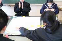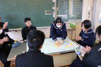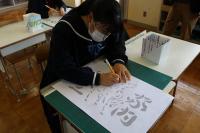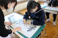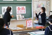12月10日(水)、2年生は公民館主事の脇田さんと地域の坂谷さんをお招きし「蓬莱の作り方」を教えていただきました。思い思いの図柄を選び、線に沿ってカッターで切り抜き、絵を浮かび上がらせました。細かい作業でしたが、丁寧に作品作りに取り組むことができました。