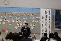 12月2日(火)、みさき小学校で学校運営協議会の「熟議」が行われ、小学5年生~中学3年生、地域の方、保護者の方、職員が参加しました。今回は、三崎駐在所の道善さんをお招きし、「道善さんに学ぶ三崎町の魅力」について、お話をしていただきました。「食…水が美味しい。魚が美味しい」「環境…空気や海がきれい。喘息の薬の量が減る」「人…距離感が良い。コミュニケーションが上手」など、三崎町の魅力について伝えてくださいました。道善さんも魅力について伝えることが難しいと感じられたらしく、「好きなものは好き」にたどり着いたそうです。改めて三崎町の良さを再発見する時間となりました。道善さん、ありがとうございました。