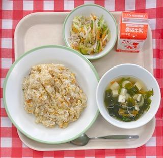 ごはん、牛乳、白身魚のみそ蒸し焼き、おひたし、とりやさい汁