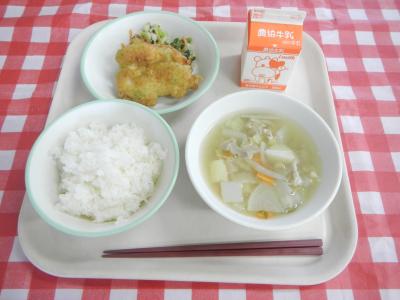 2023/11/24 ご飯、牛乳、いそべ鶏天、梅肉和え、豚汁
