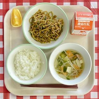 11/6 ご飯、牛乳、さばの塩麹焼き、ちくわの梅肉和え、めった汁