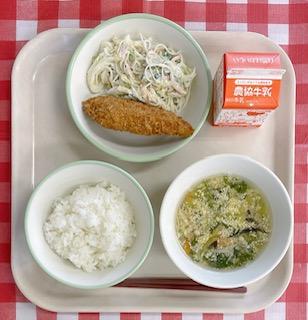 11/6 ご飯、牛乳、さばの塩麹焼き、ちくわの梅肉和え、めった汁