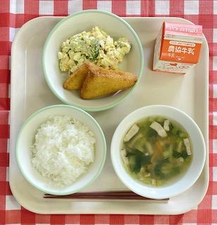 ベースの中華スープに、コーンクリームが入っているので、優しい甘さが生徒に人気の汁物です。