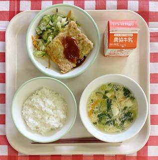 ベースの中華スープに、コーンクリームが入っているので、優しい甘さが生徒に人気の汁物です。