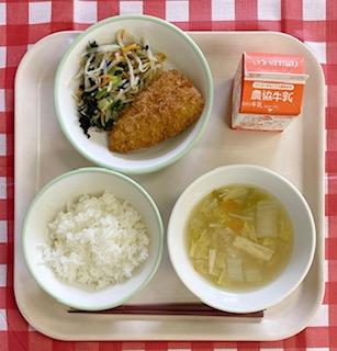 ベースの中華スープに、コーンクリームが入っているので、優しい甘さが生徒に人気の汁物です。