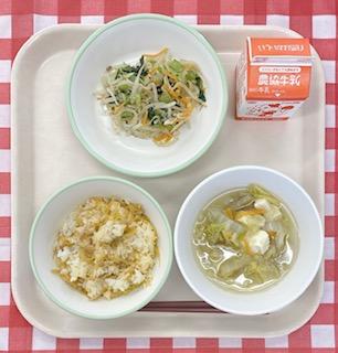 ベースの中華スープに、コーンクリームが入っているので、優しい甘さが生徒に人気の汁物です。