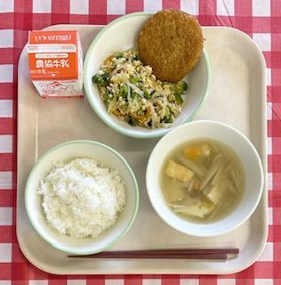 ベースの中華スープに、コーンクリームが入っているので、優しい甘さが生徒に人気の汁物です。