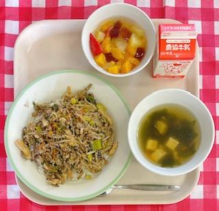 ベースの中華スープに、コーンクリームが入っているので、優しい甘さが生徒に人気の汁物です。