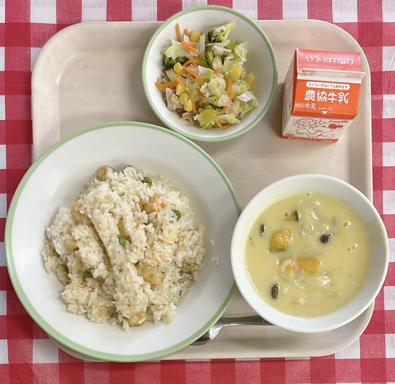 ベースの中華スープに、コーンクリームが入っているので、優しい甘さが生徒に人気の汁物です。