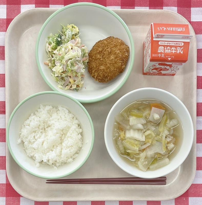 ベースの中華スープに、コーンクリームが入っているので、優しい甘さが生徒に人気の汁物です。