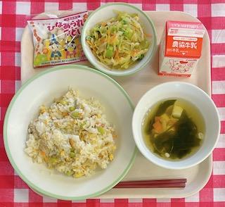 ベースの中華スープに、コーンクリームが入っているので、優しい甘さが生徒に人気の汁物です。