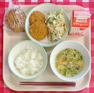 ベースの中華スープに、コーンクリームが入っているので、優しい甘さが生徒に人気の汁物です。