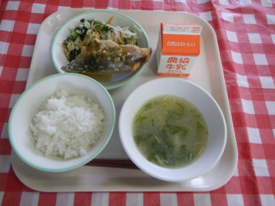 2025/6/23 ご飯、牛乳、さばのピリ辛だれ、もやしの酢の物、水菜のみそ汁