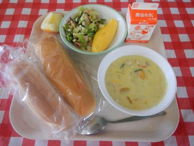 2024/12/12 コッペパン、牛乳、オムレツ、ひじきサラダ、米粉のシチュー珠洲かぼちゃ入り!