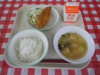 10/22(火)ごはん、牛乳、白身魚フライ、ハムマヨサラダ、厚揚げのみそ汁