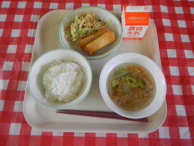 2024/10/24 ご飯、牛乳、春巻き、もやしのナムル、スープ