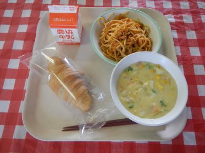 2024/10/25 クロワッサン、牛乳、スパゲティミートソース、コーンクリームスープ
