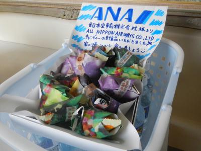 今日はANAより、キャンディーの支援品がとどきました。