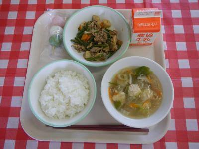 ごはん、牛乳、アスパラと里芋と豚肉の照り焼き炒め、鶏団子スープ、3色団子
