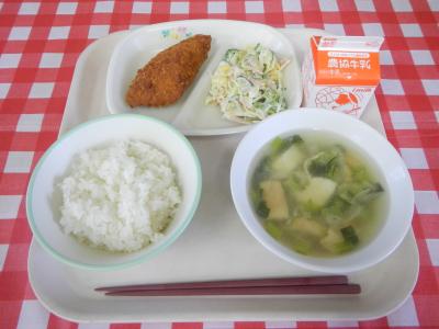 ごはん、牛乳、白身フライ、コーンサラダ、みそ汁