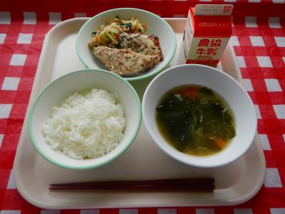 10/20 ご飯、牛乳、さばの竜田揚げ、しめじ和え、じゃがいもの味噌汁