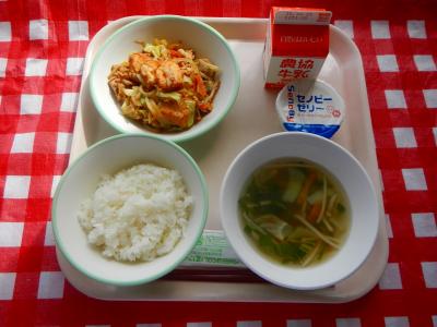 2025/10/21 ご飯、牛乳、豚肉と厚揚げの味噌炒め、五色汁、セノビーゼリー