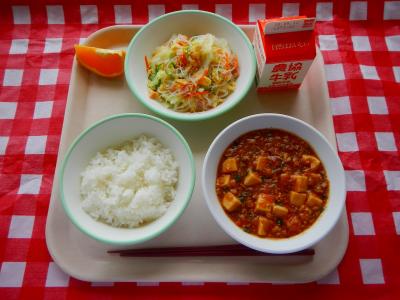 2025/9/8 ご飯、牛乳、バンサンスー、麻婆豆腐、オレンジ